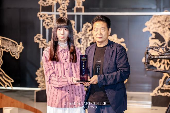 中央美术学院教授、博士生导师张子康为青年新锐奖获奖者王怡宁颁奖